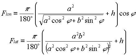 | Latitude, º | Flon, m/º | Flat, m/º | Flon, m/º | Flat, m/º |